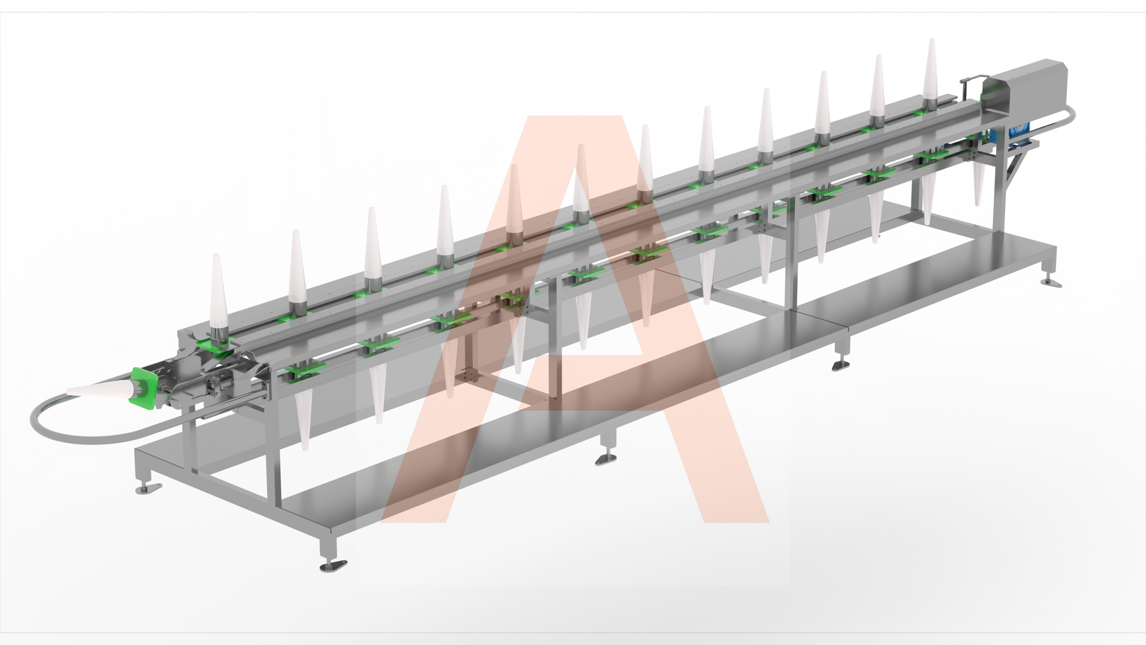 Alberk Kazıklı Parçalama Bandı, operatör destekli manuel parçalama sürecini optimize ederek işlem doğruluğunu artırır. Sabit hızda ilerleyen bant üzerinde sabitlenen tavuklar, çift taraflı çalışma imkânı ile yüksek kapasitede işlenir. Paslanmaz şase, plastik baklalı zincir ve polietilen kazıklar ile donatılan sistem, hijyen ve dayanıklılığı bir arada sunar. Modüler yapısı sayesinde farklı tesis düzenlerine kolayca entegre edilir.